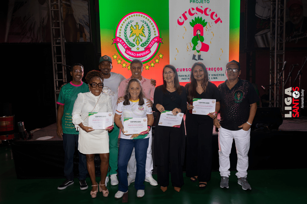 A noite também marcou a entrega dos certificados para as alunas da 1a turma do Curso de Aderecistas do Projeto Crescer, iniciativa que capacitou as participantes a desempenharem a função no Barracão da escola de samba, coordenada pelo Prof. Carlos Lima.