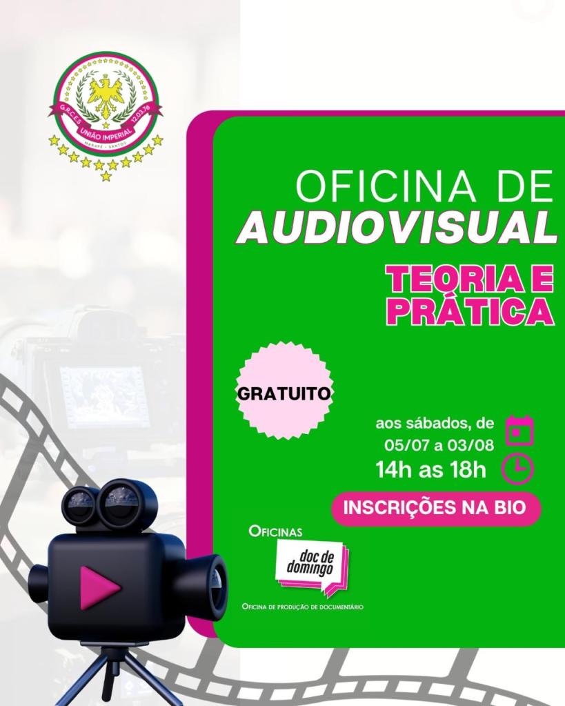 A União Imperial e o Projeto Doc de Domingo vão oferecer gratuitamente à comunidade uma Oficina de Iniciação em Audiovisual, focada em todas as etapas da produção de um filme documentário. A atividade será realizada nos dias 5, 12, 19, 26 de julho e 3 de agosto, sempre aos sábados, das 14h às 18h, na Quadra da União Imperial (R. São Judas Tadeu, 20/26 – Marapé- Santos)..